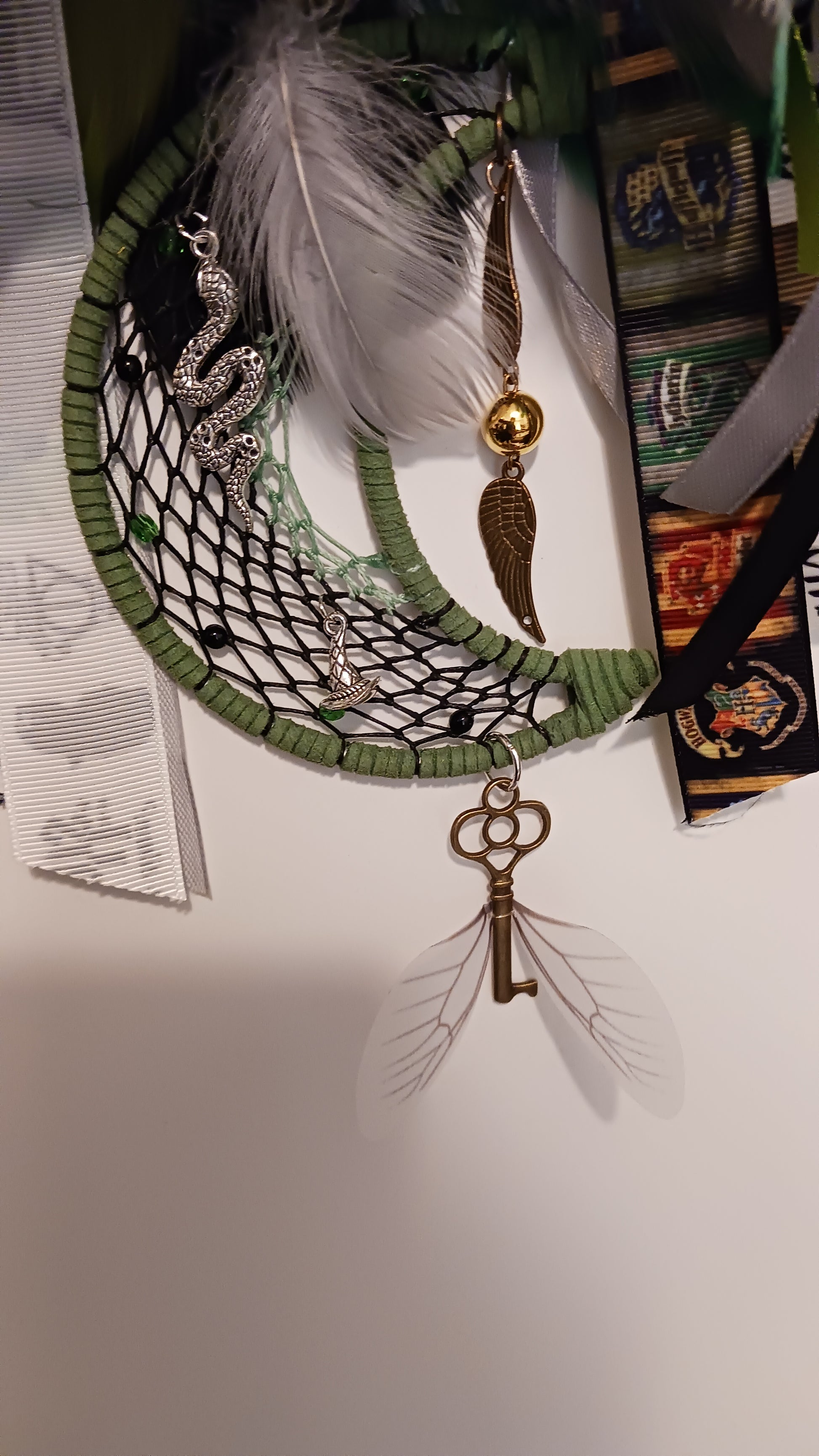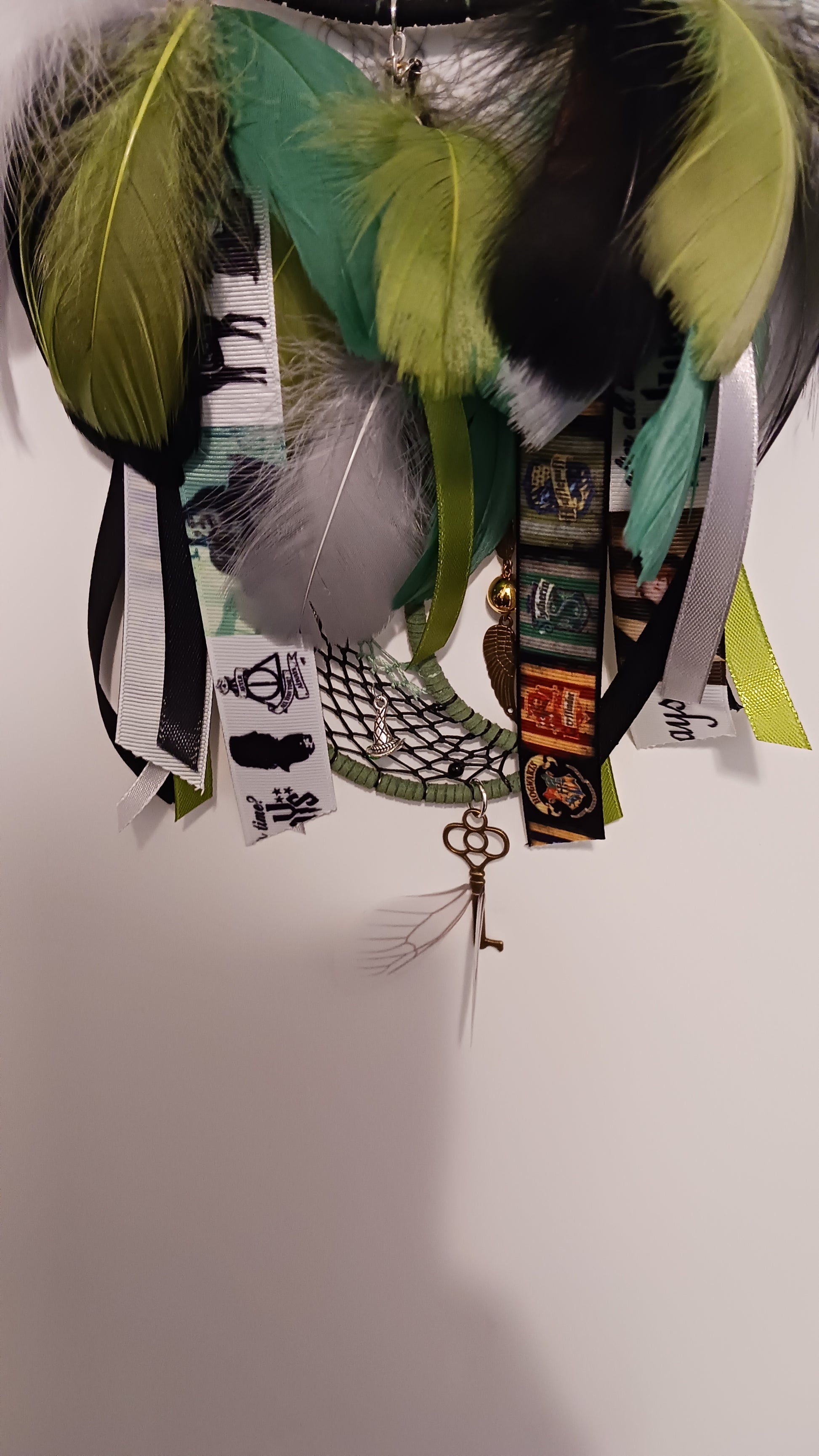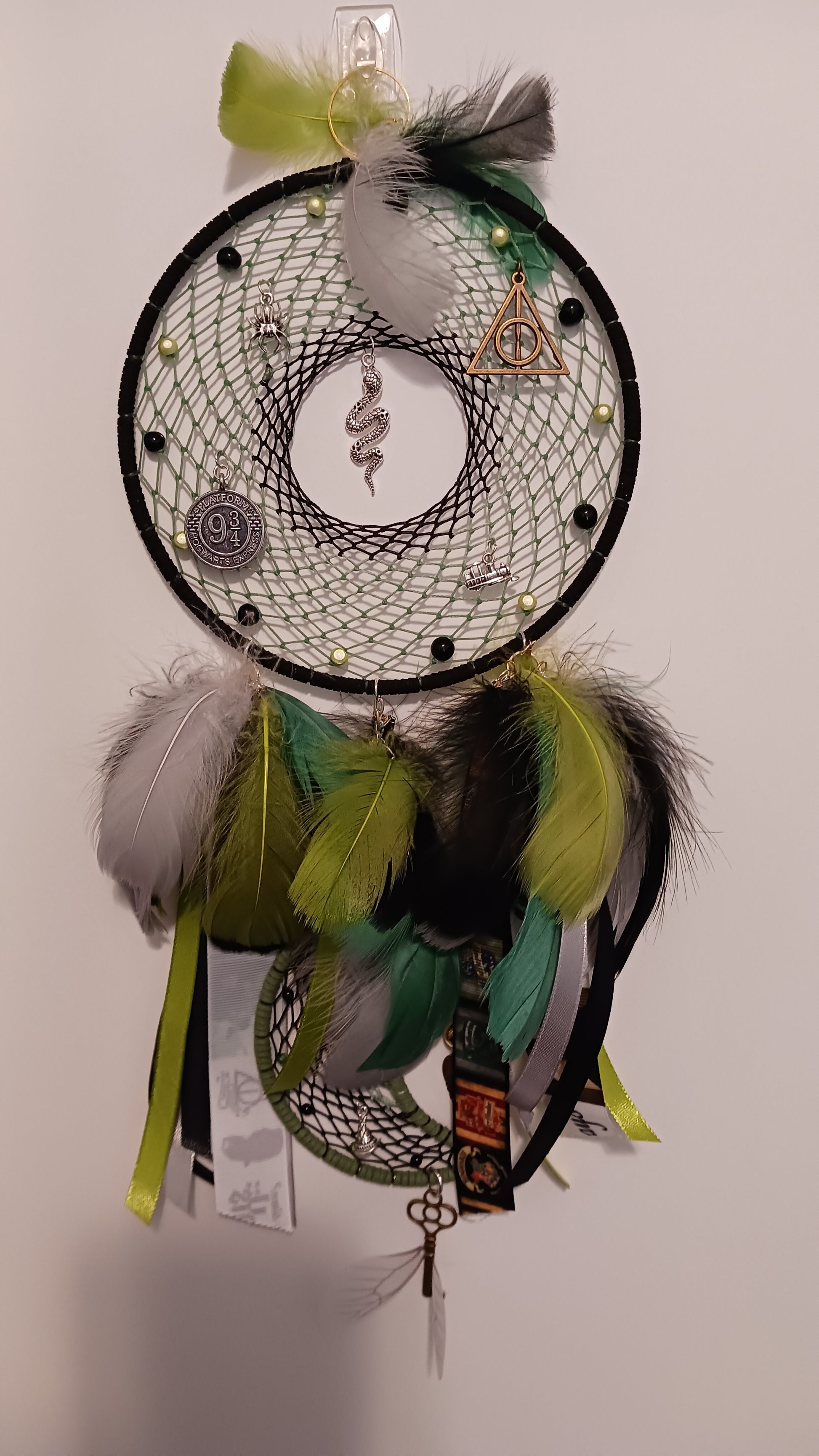 This unique two-piece dream catcher design captures the essence of Slytherin through its iconic color scheme of green and silver, representing the house's connection to serpents and its pursuit of greatness. The deep, emerald green signifies the depth of the Slytherin spirit, while the shimmering silver adds a touch of sophistication and ambition.